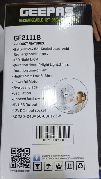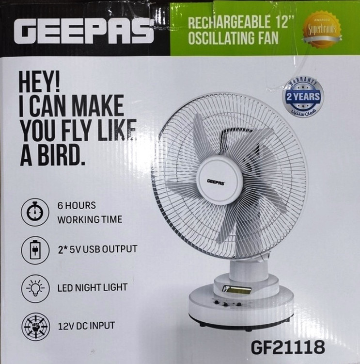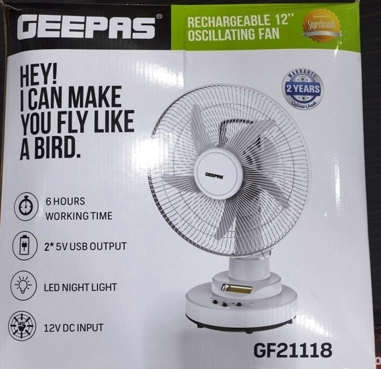 پنکه شارژی 12 اینچی Geepas GF21118 با طراحی مدرن و پایه سفید